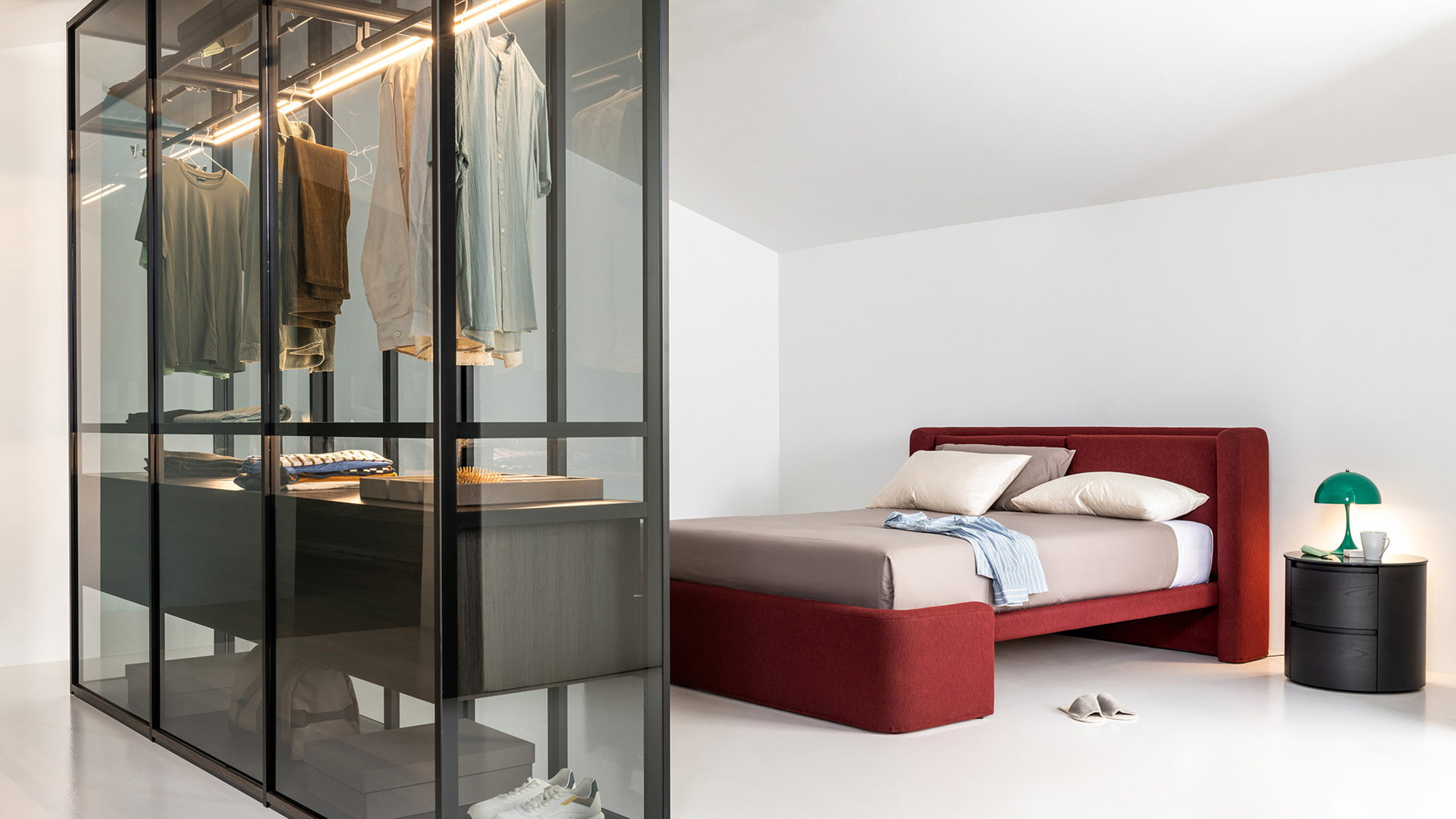 Wie zwei Schalen umarmen ein Kopf- und Fußteil das Bett Dimora, ein Entwurf von Cristina Celestino. Die italienische Designerin erzählt mit ihrem Entwurf die Geschichte eines Oxymorons: Dimora charakterisiert eine weiche Strenge und eine opulente Präsenz, erscheint wie eine Architektur in der Architektur. Das Bett rückt ins Zentrum, wird zum wesentlichen Objekt im Raum.